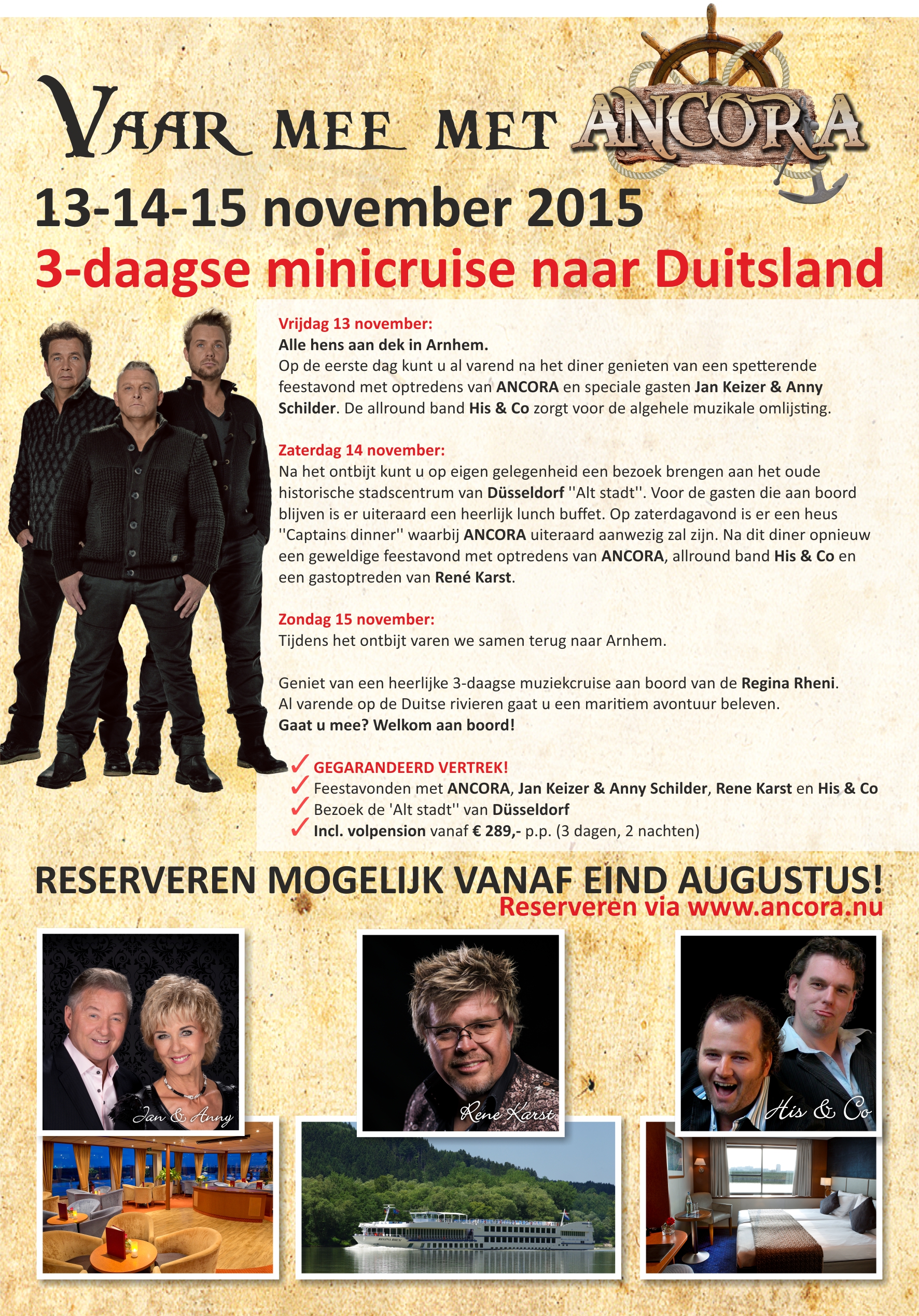 Ivm een annulering zijn er 5 hutten opnieuw in de verkoop gegaan voor onze mini cruise op 13,14 en 15 november a.s. met als muzikale gasten Jan Keizer & Anny Schilder, Rene Karst en His & Co.
